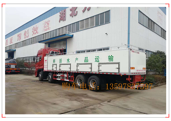 湖北力威牌東風(fēng)天龍鮮活魚運(yùn)輸車標(biāo)準(zhǔn)配置:罐體有效容積16方,總質(zhì)量31噸,底盤自重9.5噸,整車自重15噸,魚箱重量6噸,7個(gè)獨(dú)立分倉,魚箱16立方米,拉魚重量18000斤,采用東風(fēng)天龍前四后八底盤,D310(小改樣)高頂雙臥四點(diǎn)懸浮駕駛室,雷諾420馬力國(guó)五發(fā)動(dòng)機(jī),發(fā)動(dòng)機(jī)形式:立式、直列、水冷、四沖程、電控直噴,最大輸出功率:309kw,車架前寬940mm,后寬860mm,電阻加熱冷起動(dòng)裝置,全鋁580L主燃油箱,有燃油箱鎖,電子油門踏板及開關(guān),雙級(jí)濾芯空濾器,消聲器側(cè)置排氣口朝向側(cè)吹,EATON(伊頓)Φ430mm拉式膜片彈簧離合器,陜齒12檔12JSD200TA變速箱,頭檔速比12.10,最高檔為超速檔,5T雙前橋,可維護(hù)輪端,10T單級(jí)減速雙后橋(東風(fēng)435),主減速比3.909,可維護(hù)輪端,有軸間差速鎖,無輪間差速鎖,車架縱粱斷面尺寸280×80×(8+4)mm,鋼板彈簧片數(shù)3/3/-,整體式動(dòng)力轉(zhuǎn)向器,12R22.5子午胎-無內(nèi)胎,自動(dòng)調(diào)整臂.原廠空調(diào),電動(dòng)門窗,ABS,行程記錄儀。2-3匹制冷機(jī)組,電動(dòng)液壓舉升裝置,300L剛油箱,2個(gè)210升壓縮液態(tài)氧罐(一罐液態(tài)氧可用36個(gè)小時(shí)),長(zhǎng)途可以加裝4個(gè)液態(tài)氧氣瓶,外加10cm保溫箱體魚罐底部從前到后加裝3條1.5寸通風(fēng)管道,以增強(qiáng)制冷效果,前四后八魚車都安裝獨(dú)立柴油發(fā)動(dòng)機(jī)帶動(dòng)水循環(huán)過濾裝置,也可以加裝雙循環(huán)過濾系統(tǒng),車廂頂部安裝電動(dòng)小吊機(jī),方便裝卸魚,一次能吊400-500斤活魚,魚箱底部安裝溫度顯示器,能把魚罐的水溫直接傳輸?shù)今{駛室顯示屏上,氧氣開關(guān)也可以連接到駕駛室內(nèi),在駕駛室里面可以調(diào)控氧氣大小,帶兩2.5匹制冷空調(diào)(4000瓦制冷量)箱體與內(nèi)呂罐達(dá)到一個(gè)合理的制冷效果,側(cè)出魚口方向帶側(cè)門,以方便處于,其它按照運(yùn)魚車常規(guī)配置作,此車型用戶按照貨物運(yùn)輸車上戶,罐體噴《鮮活魚運(yùn)輸車》字樣。是運(yùn)用生物學(xué)、水環(huán)境工程學(xué)、水產(chǎn)養(yǎng)殖學(xué)、養(yǎng)殖水處理工程學(xué)等原理,與自動(dòng)控制、高效除污、高壓增氧、生物過濾等多項(xiàng)現(xiàn)代化高新技術(shù)結(jié)合。活魚運(yùn)輸車具有運(yùn)輸時(shí)間長(zhǎng)、運(yùn)魚量大、適用范圍廣、成活率高和受外界氣候影響小等優(yōu)點(diǎn),是目前進(jìn)行長(zhǎng)途運(yùn)輸?shù)南冗M(jìn)工具。罐體堅(jiān)固耐用,可以使用多年,一次性投資長(zhǎng)期受益,運(yùn)輸成本不高,是目前長(zhǎng)途活魚運(yùn)輸車的好方法。在不影響車輛正常行駛、運(yùn)輸能力不下降的情況下,我們巧妙的在原車發(fā)動(dòng)機(jī)與變速箱之間另安裝一臺(tái)夾心取力器,通過夾心取力器取力、借力,帶動(dòng)一臺(tái)專用制冷機(jī)組及水循環(huán)泵,讓裝魚罐內(nèi)(箱體內(nèi))確保維持魚存活的有限的水量范圍內(nèi)來進(jìn)行自動(dòng)循環(huán)過濾。在水循環(huán)的過程中,通過制冷機(jī)組對(duì)水進(jìn)行降溫處理(溫度可按不同的魚種進(jìn)行任意設(shè)定)達(dá)到一個(gè)魚生存環(huán)境較理想的水溫狀態(tài)(同時(shí)裝魚的罐體或箱體還設(shè)計(jì)了保溫裝置),同時(shí)我們還有一套增氧供氧系統(tǒng)。這樣一來,魚生存在一個(gè)溫度合適,水質(zhì)干凈,含氧量高的一個(gè)水環(huán)境里,任你運(yùn)輸距離有多遠(yuǎn),魚始終不會(huì)產(chǎn)生死亡現(xiàn)象,而且用戶一次投入,終身享用,也不會(huì)增加任何額外運(yùn)輸成本。