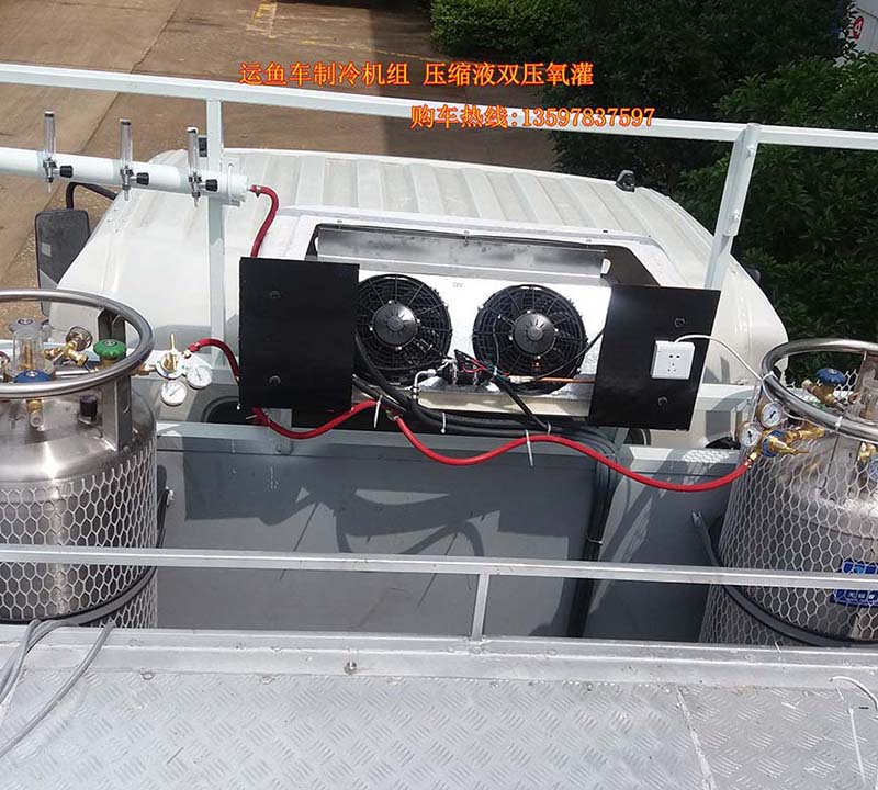 通過制冷機(jī)組能把水溫控制在10-18度,隨車配帶2匹到3匹的制冷機(jī)組,通過發(fā)動(dòng)機(jī)帶動(dòng)制冷機(jī)組工作,車不熄火制冷機(jī)組一直在工作,內(nèi)罐為6mm鋁合金罐體,罐體兩側(cè)有風(fēng)道,通過空調(diào)對魚罐降溫,鋁材導(dǎo)熱快,制冷相對也就快,一個(gè)小時(shí)能把溫度降下來,起到恒溫的作用。