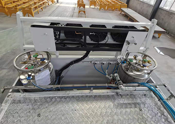 每臺車配備一個制冷機組,通過原車動力帶動制冷機工作,把冷機冷氣通過風(fēng)冷式輸送到魚倉四周,夏天控制水溫10度到18度,車不熄火制冷機組一直在工作,內(nèi)罐為6mm鋁合金罐體,罐體兩側(cè)有風(fēng)道,通過空調(diào)對魚罐降溫,鋁材導(dǎo)熱快,制冷相對也就快,一個小時能把溫度降下來,起到恒溫的作用。魚在這個溫度下活動是比較少的,這樣就能避免魚到處游動掉膘降低水溫可減少活魚在運輸過程中的活動量,減弱新陳代謝,減少氨氮CO2的排放,一定程度上保證了水質(zhì);同時可減輕水產(chǎn)品之間相互碰撞、撕咬所造成的損傷,保證水產(chǎn)品活體質(zhì)量。由于大多數(shù)水產(chǎn)品對溫度較敏感,環(huán)境驟變會導(dǎo)致其生病甚至死亡,因此在運輸中,應(yīng)選擇梯度降溫,降溫速度不大于3℃/h。在運輸達目的地后,應(yīng)該將目的地水箱的水和運載水逐漸混合,待所運輸水產(chǎn)品適應(yīng)溫度等環(huán)境后,再移入新的水箱。