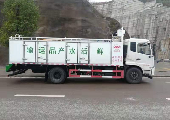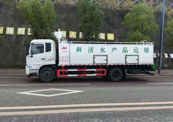 東風(fēng)天錦國(guó)六運(yùn)魚(yú)車整車總質(zhì)量18噸,魚(yú)車質(zhì)量9.3噸,采用東風(fēng)天錦4*2驅(qū)動(dòng),D530平頭一排半駕駛室(帶小臥鋪),康明斯210馬力國(guó)六發(fā)動(dòng)機(jī),軸距4700mm,東風(fēng)6檔DF6S900變速箱(選裝法士特小八檔變速箱),4.5T前橋,9T單級(jí)減速后橋,10.00R20鋼絲胎,手動(dòng)調(diào)整臂,有ABS,半浮式后懸機(jī)械減震駕駛室懸置,液壓機(jī)械翻轉(zhuǎn),手動(dòng)玻璃升降器,手動(dòng)前車門(mén)鎖,通道式儀表板,裝空調(diào),無(wú)巡航系統(tǒng),裝有兼容BDS北斗)/GPS衛(wèi)星定位功能的行駛記錄儀車載終端。能拉4-5噸活魚(yú),獨(dú)立泵房制氧機(jī)組,活魚(yú)運(yùn)輸車的運(yùn)載活魚(yú)能力通常為每立方米水體裝魚(yú)200千克,魚(yú)水比為1∶1,夏天控制水溫12-15度左右,途經(jīng)5-48個(gè)小時(shí)路程,運(yùn)輸成活率達(dá)99%以上。 罐體堅(jiān)固耐用,可以使用多年,一次性投資長(zhǎng)期受益,運(yùn)輸成本不高,是目前長(zhǎng)途運(yùn)輸活魚(yú)的好方法。