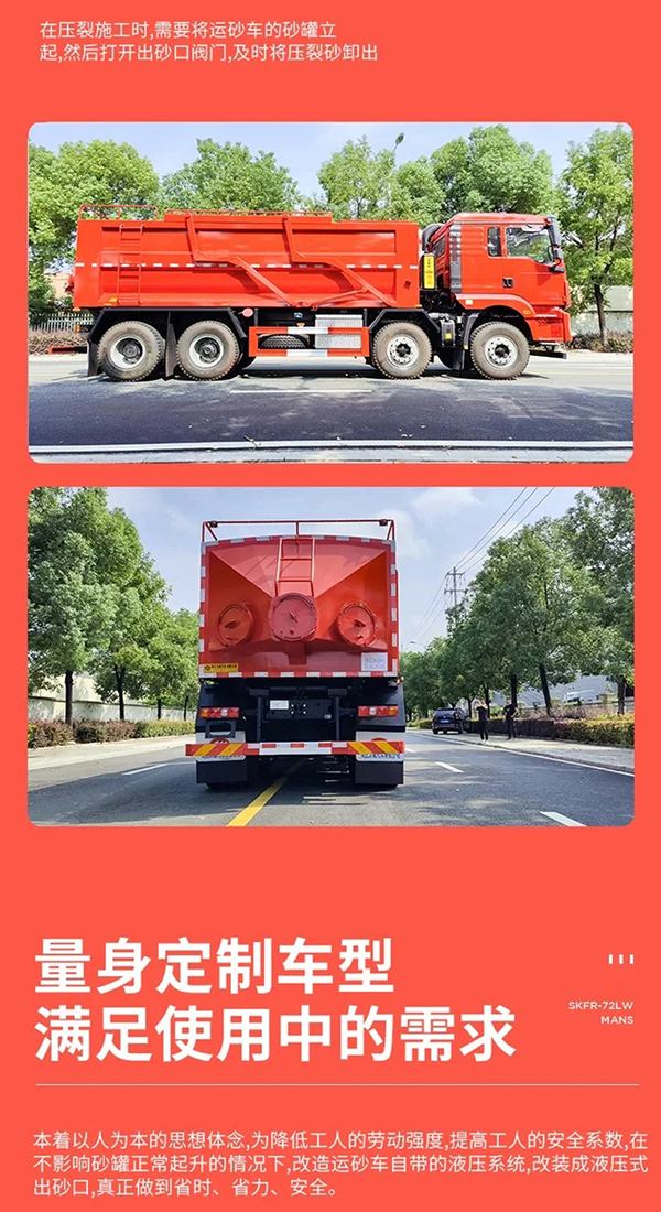 中汽力威牌陜汽壓裂砂罐車主要包括罐體;罐體內(nèi)壁為連續(xù)的弧面;罐體的尾部設(shè)置有至少一個出砂口;出砂口為旋轉(zhuǎn)式出砂口;出砂口上方還設(shè)置有爬梯.現(xiàn)有技術(shù)中的壓裂砂罐車罐體內(nèi)部,是直角方艙式,卸沙經(jīng)常有殘留;本實用新型中的砂罐車罐體內(nèi)部為***弧面式,提高了卸砂效率.本實用新型中的砂罐車出砂口為輕巧便捷的旋轉(zhuǎn)式出砂口,方便人員操作;并增加檢查爬梯.該出砂口可設(shè)置多個,多角度分配.本實用新型中的砂罐車頂部裝砂口設(shè)置有破沙袋,即使需要人員登高至罐頂裝砂口,破袋效***且減輕了人員操作風險,還降低了作業(yè)強度.且破袋器周圍設(shè)置走臺,方便人員走位操作。