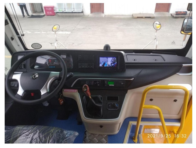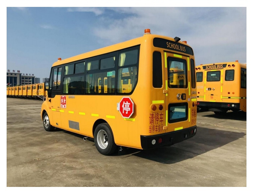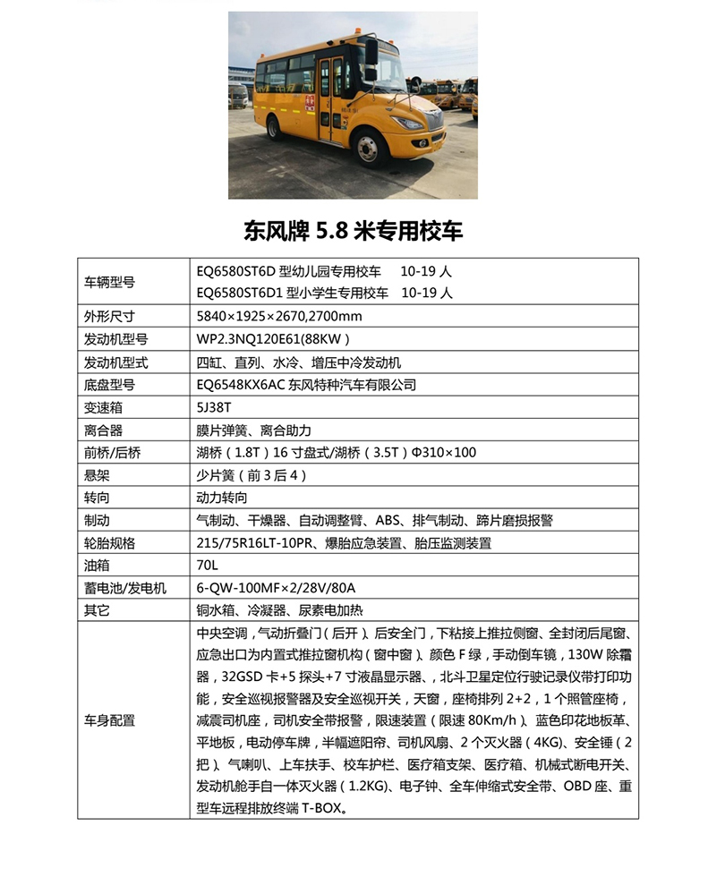東風(fēng)19座小學(xué)生校車底盤配置:采用東風(fēng)底盤EQ6548KX6AC,五檔變速器,限速裝置,ABS,油剎,鋼板前3后4,前輪盤式制動,前后穩(wěn)定桿,整體式動力轉(zhuǎn)向,匹配濰柴120馬力發(fā)動機(jī)。身標(biāo)準(zhǔn)配置: 前風(fēng)擋大功率吸風(fēng)式除霜機(jī),校車內(nèi)飾新式工作臺,軟化護(hù)欄,上車滾花扶手,平地板加地板革,3把防盜型安全錘,GPS行車記錄儀,校車標(biāo)志燈帶防護(hù)網(wǎng),MP3收放機(jī),車內(nèi)外錄像監(jiān)控系統(tǒng),下1/2封閉上推拉內(nèi)嵌窗,玻璃顏色為淺牡丹綠,流水槽,逃生天窗一個,電動遙控折疊門,側(cè)安全門,校車專用座椅2+2布置,配裝卷收式安全帶,校車款后視鏡加大補(bǔ)盲鏡,校車整車陰極電泳,專用校車油漆。電喇叭、司機(jī)電風(fēng)扇一個,乘客區(qū)四個風(fēng)扇,電子鐘,滅火器2個、發(fā)動機(jī)倉滅火器,隨車工具,醫(yī)療急救箱、三角警示牌,反光背心,智能電動停車警示牌,校車巡視系統(tǒng),應(yīng)急開關(guān),窗簾,語音倒車信號。